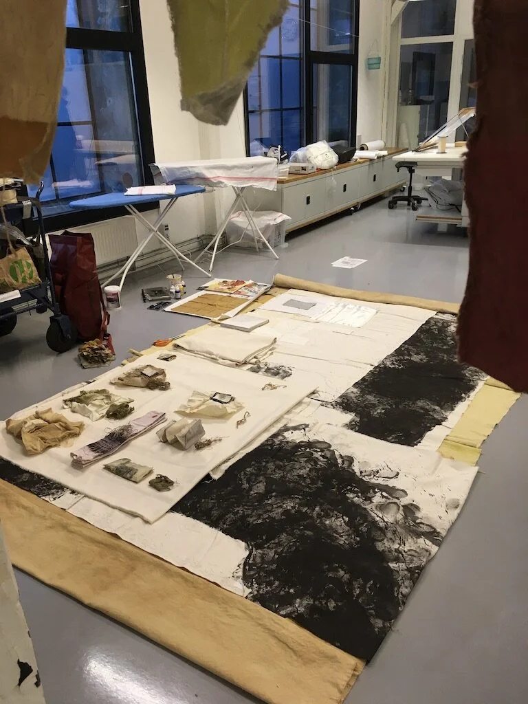 Jeg driver på. Det beste jeg vet er nettopp det; å finne fram materialer med en form for egenskap som jeg kan jobbe videre. Det kan være så enkelt som en lukt, eller et minne, eller aller helst begge deler. Nye tekstiler og materialer synes jeg ikke er like interessant. Da får de gjennomgå først. Så bruker jeg kroppen; på gulvet, på sykkelen, opp mot veggen eller jeg sleper bunten med meg ut i hagen eller der det er mulig. Så er jeg ikke så glad i pusling, så da blir det gjerne noen kilo med tekstil som jeg flytter rundt på hver dag. Og slik går tiden, og så blir det skulpturer, tegninger, tekstile installasjoner, veggarbeider. Det er ikke så mange som overlever lysten til å bearbeide videre, men noen blir det.