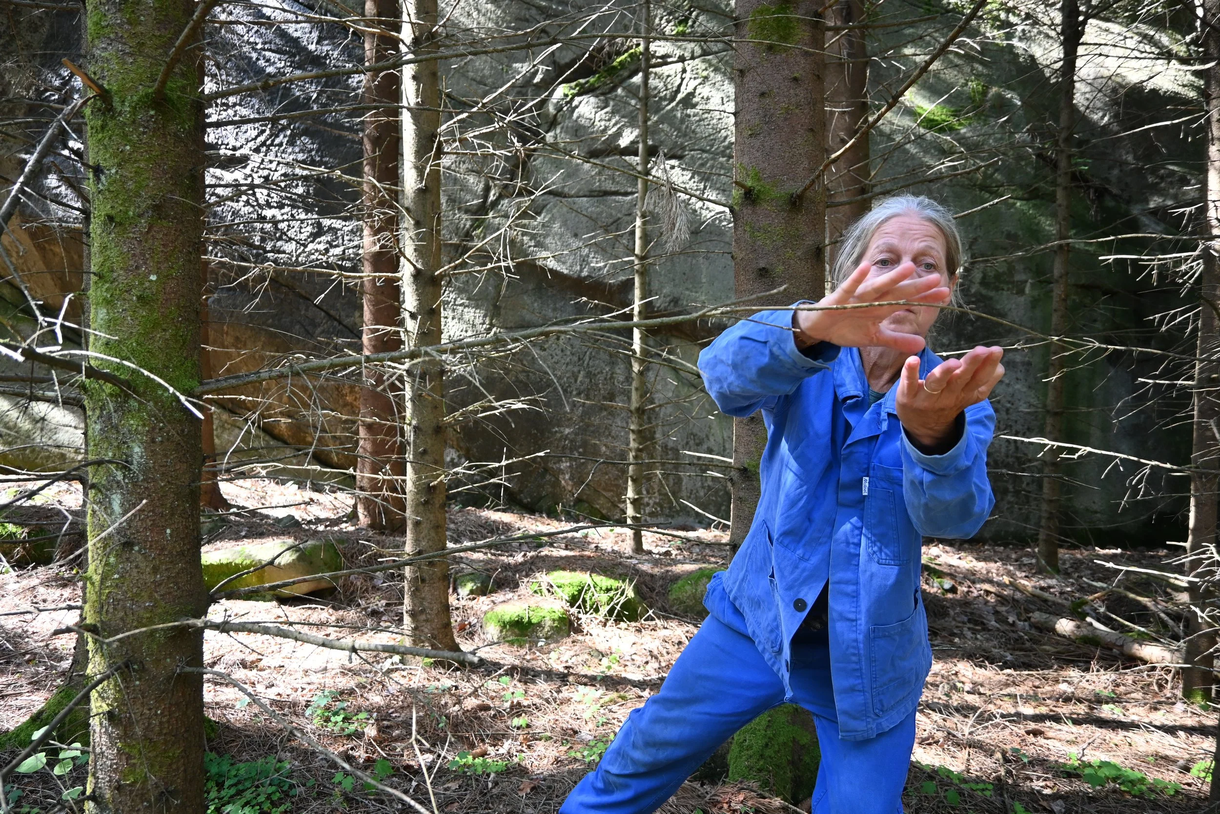 Jeg arbeider med performance, tekstil og skulptur. En hovedpilar i min kunstneriske praksis er prosjektet «Et rom uten dør», en serie utendørs performanceverk hvor jeg bruker silke farget med plantefarger som en sentral rekvisitt. Ved å bruke kroppen og silken som et slags “talerør” ønsker jeg å løfte frem hvordan naturen kan gi oss ro, konsentrasjon og nærvær. Gjennom å observere hvordan silken reagerer på naturen, har jeg blitt mer oppmerksom på nyanser jeg tidligere ikke så. Ulike steder har ulik egenart; en gammelskog kan oppleves mørk og dempet, et hogstfelt dystopisk og nakent. Denne erfaringen håper jeg kan lære oss at vi ikke står utenfor naturen, men er en del av dens mangfold - et mangfold som må vernes, fremfor å bygges ned.